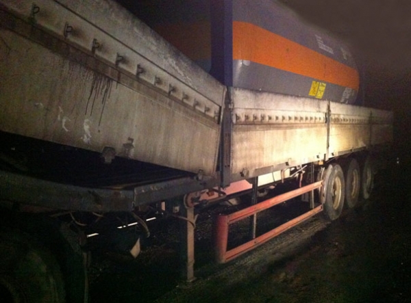 Один из многочисленных примеров эксплуатаци автохлама на дорошах Украины: на окружной дороге одного из областных центров у полудуприцепа, перевозившего опасный груз, лопнули лонжероны. К счастью, никто не пострадал.